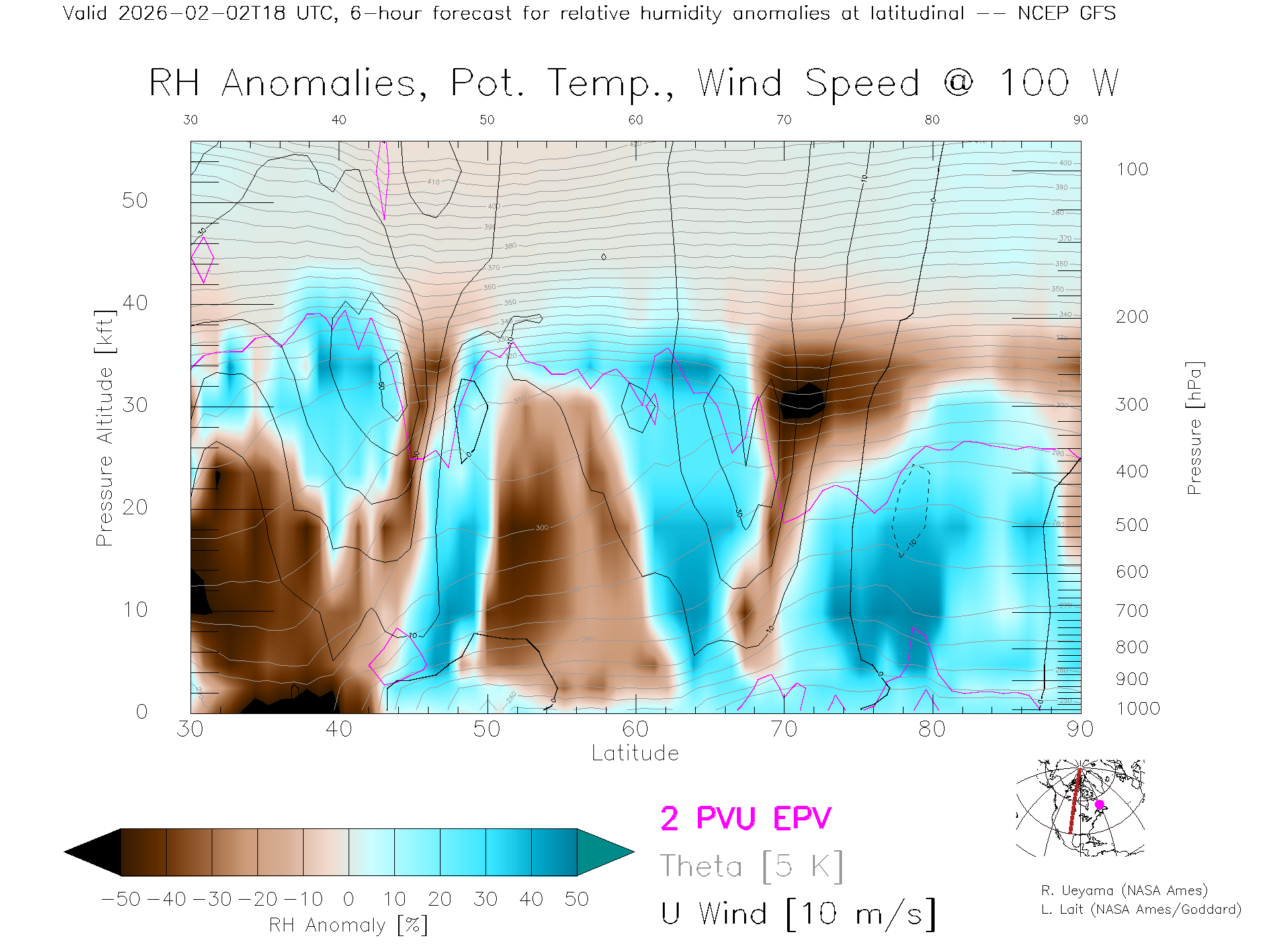 NCEP GFS Forecast Rel. Hum. X-Section (100 W)
