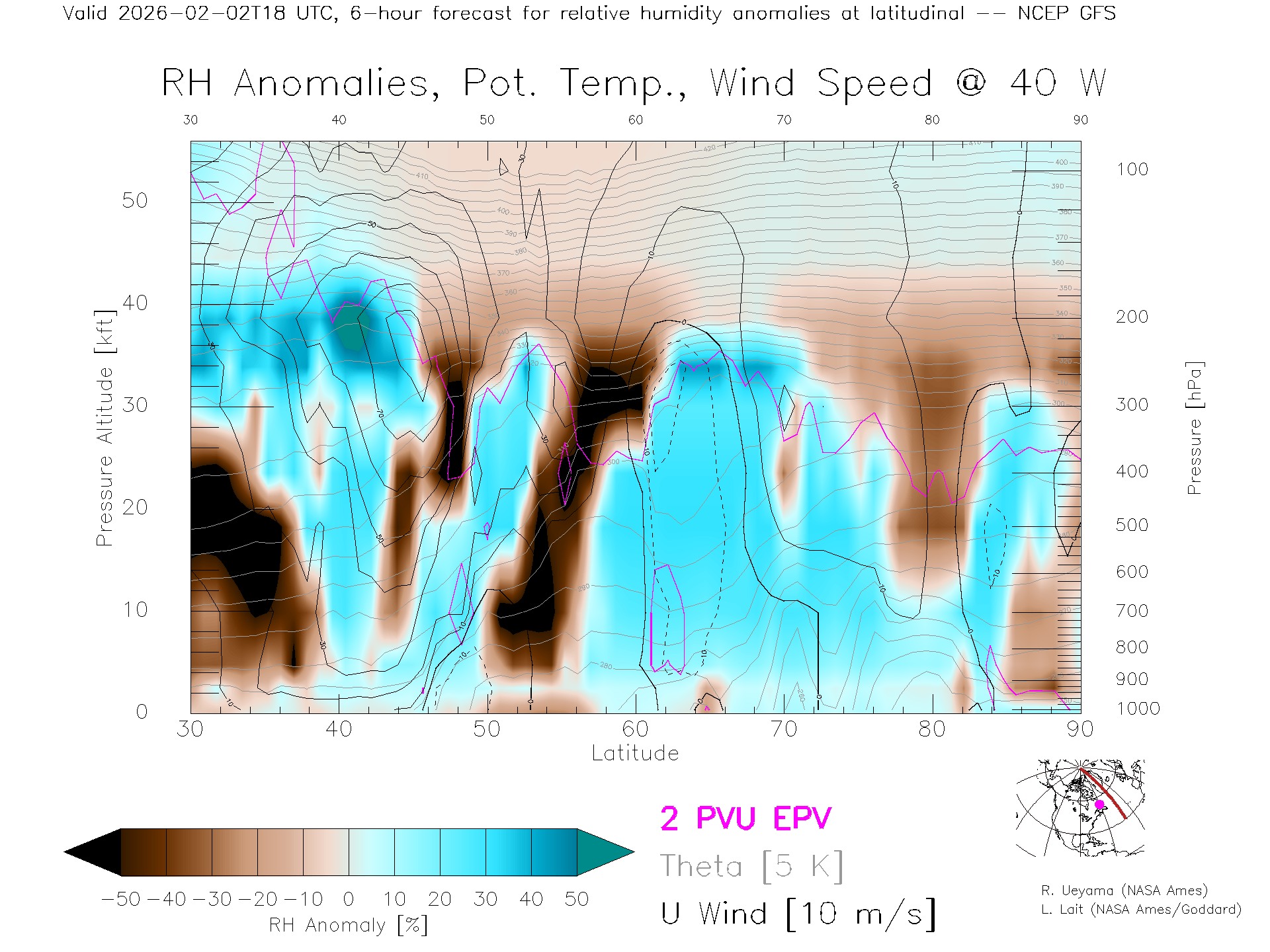 NCEP GFS Forecast Rel. Hum. X-Section (40 W)