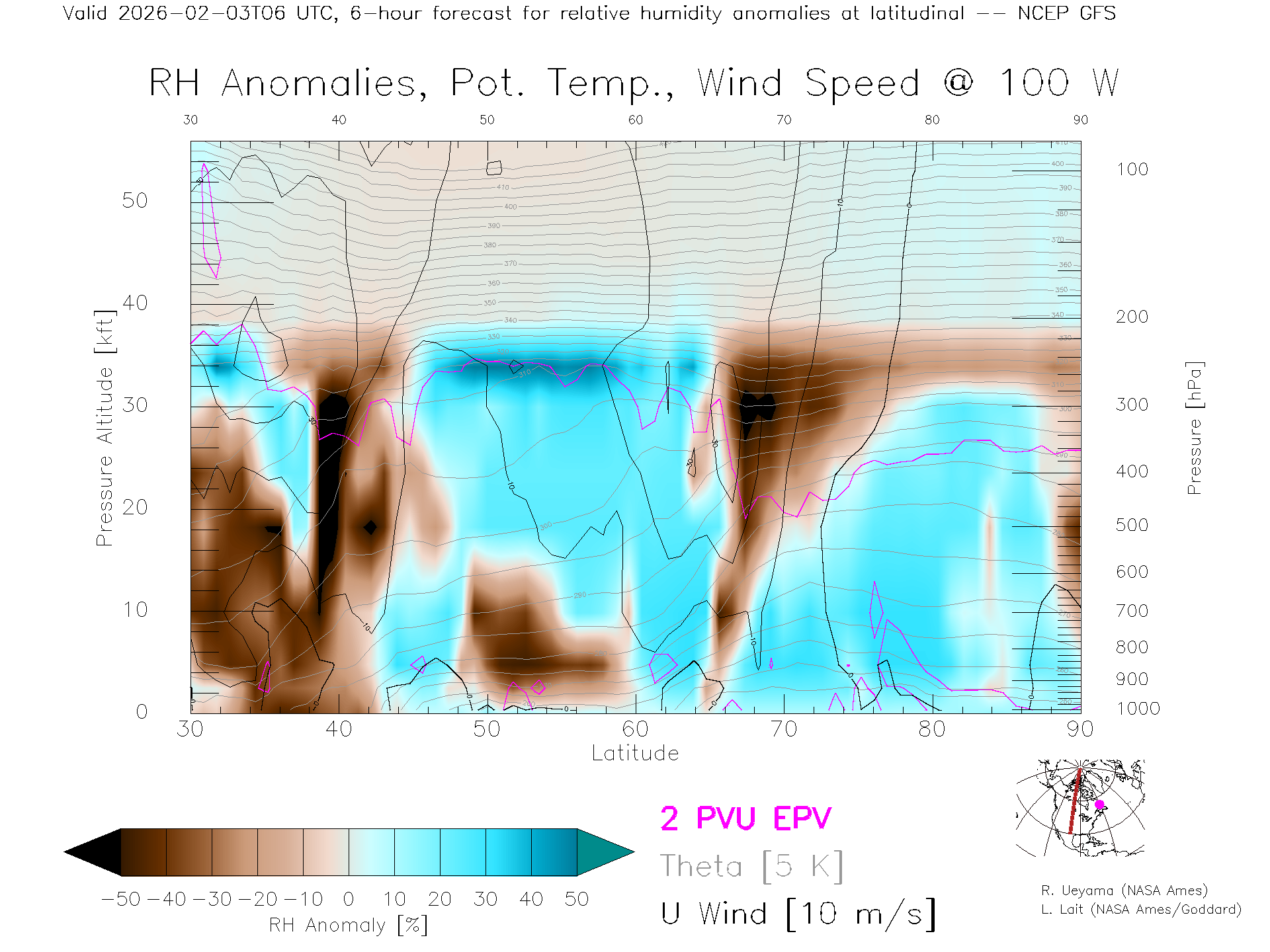 NCEP GFS Forecast Rel. Hum. X-Section (100 W)