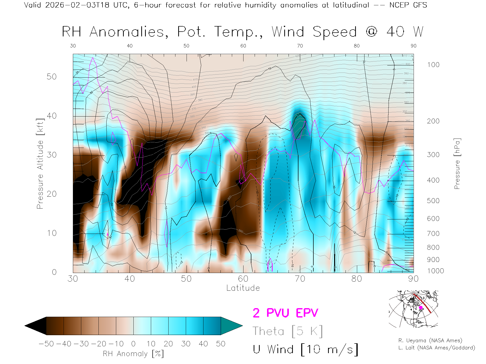 NCEP GFS Forecast Rel. Hum. X-Section (40 W)