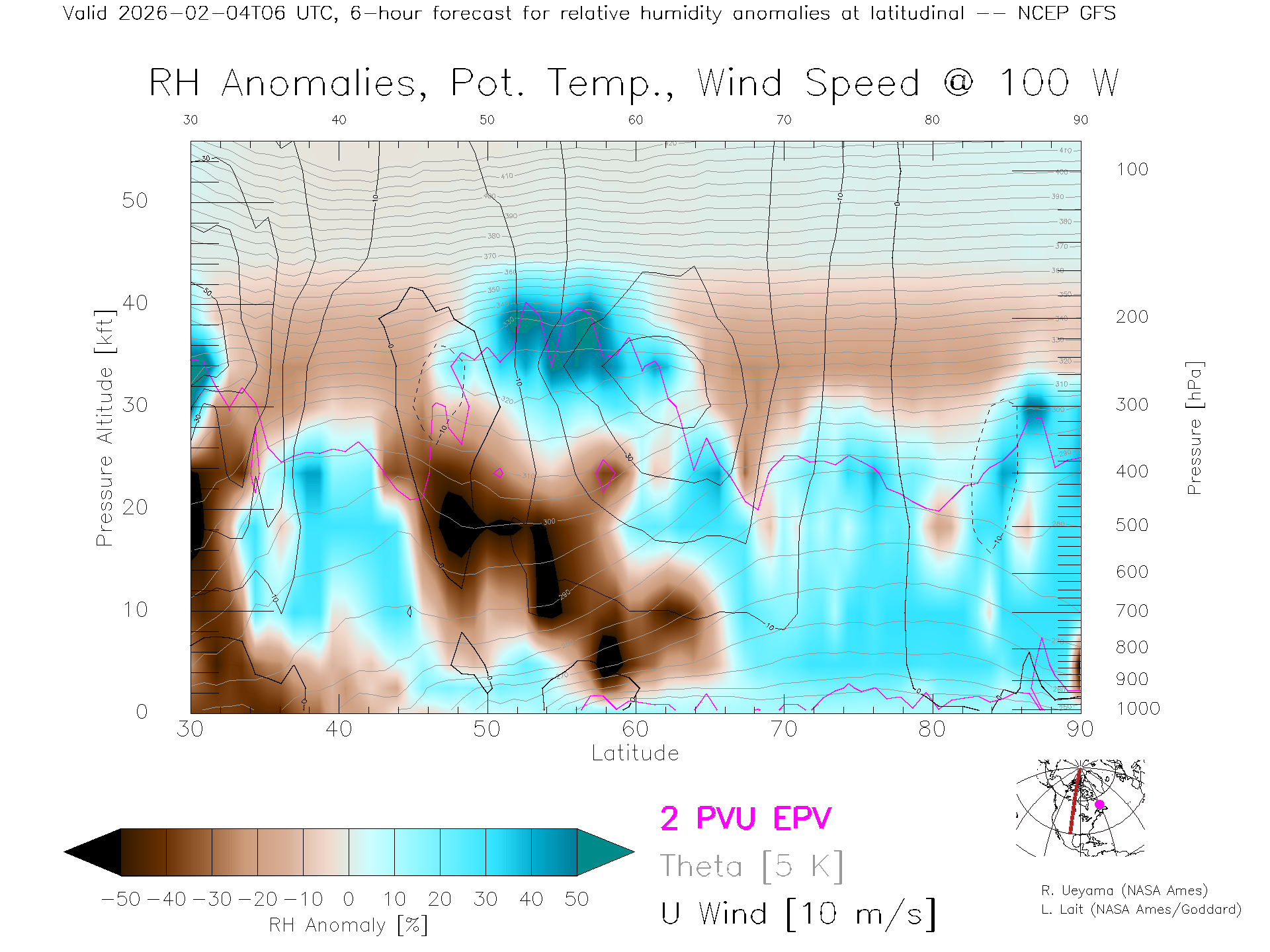 NCEP GFS Forecast Rel. Hum. X-Section (100 W)