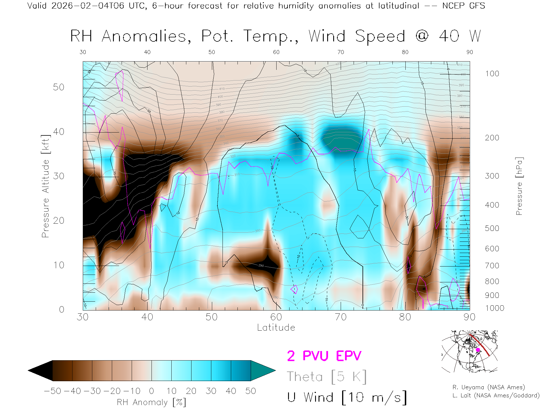 NCEP GFS Forecast Rel. Hum. X-Section (40 W)