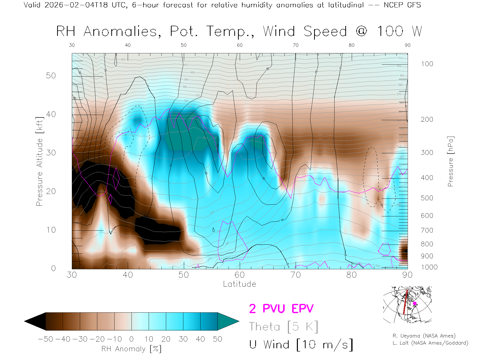 NCEP GFS Forecast Rel. Hum. X-Section (100 W)