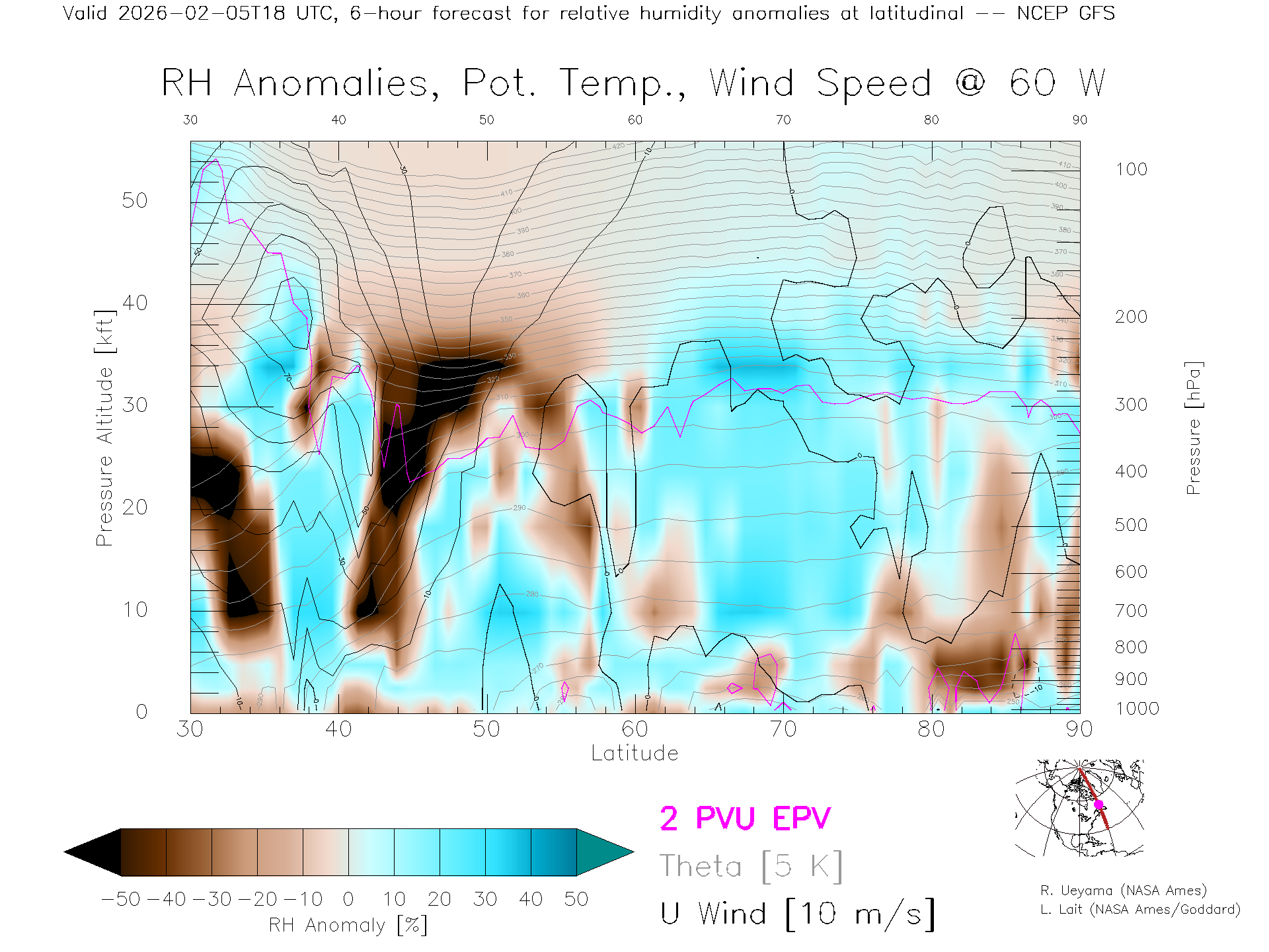 NCEP GFS Forecast Rel. Hum. X-Section (60 W)