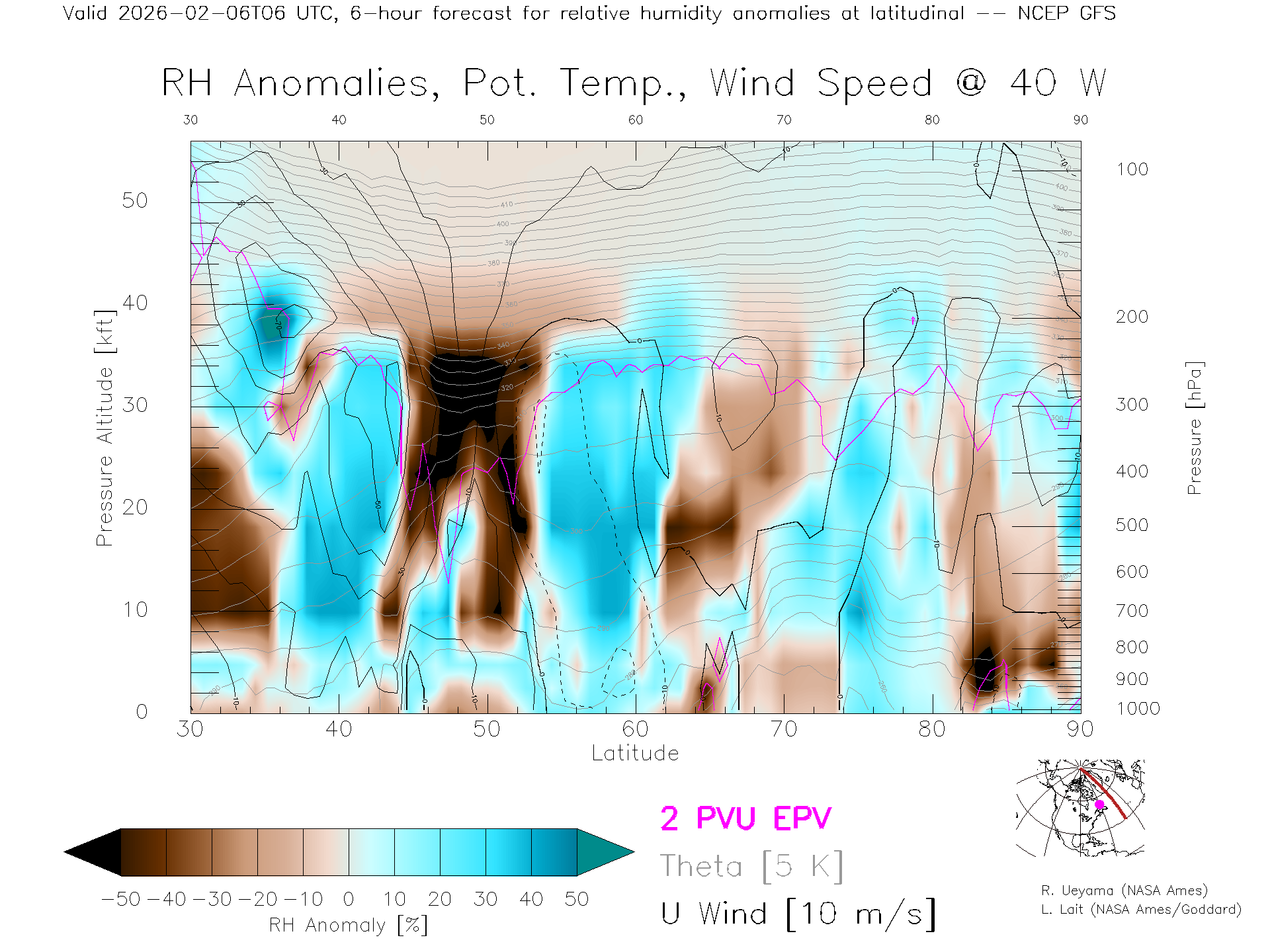 NCEP GFS Forecast Rel. Hum. X-Section (40 W)