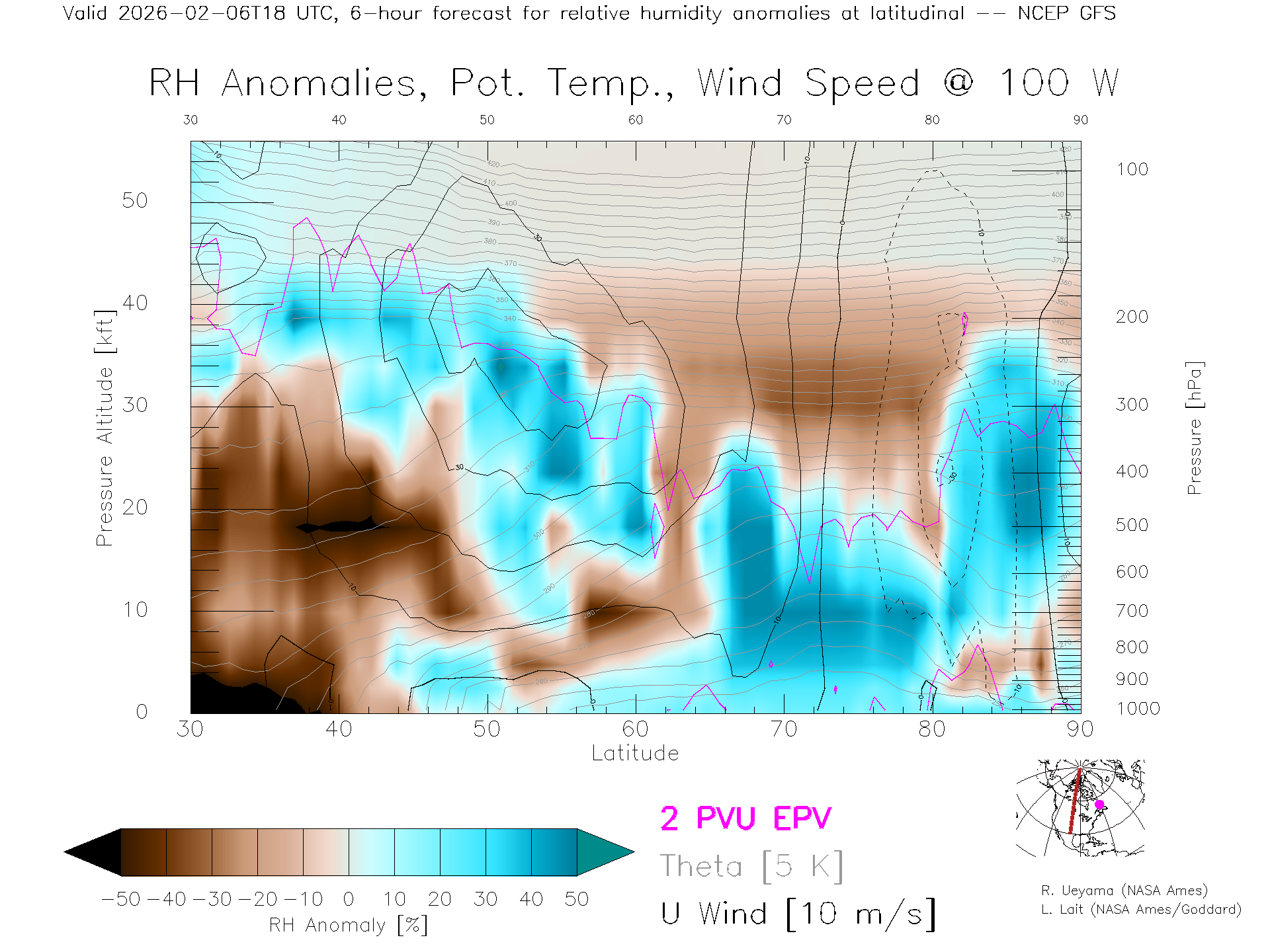 NCEP GFS Forecast Rel. Hum. X-Section (100 W)