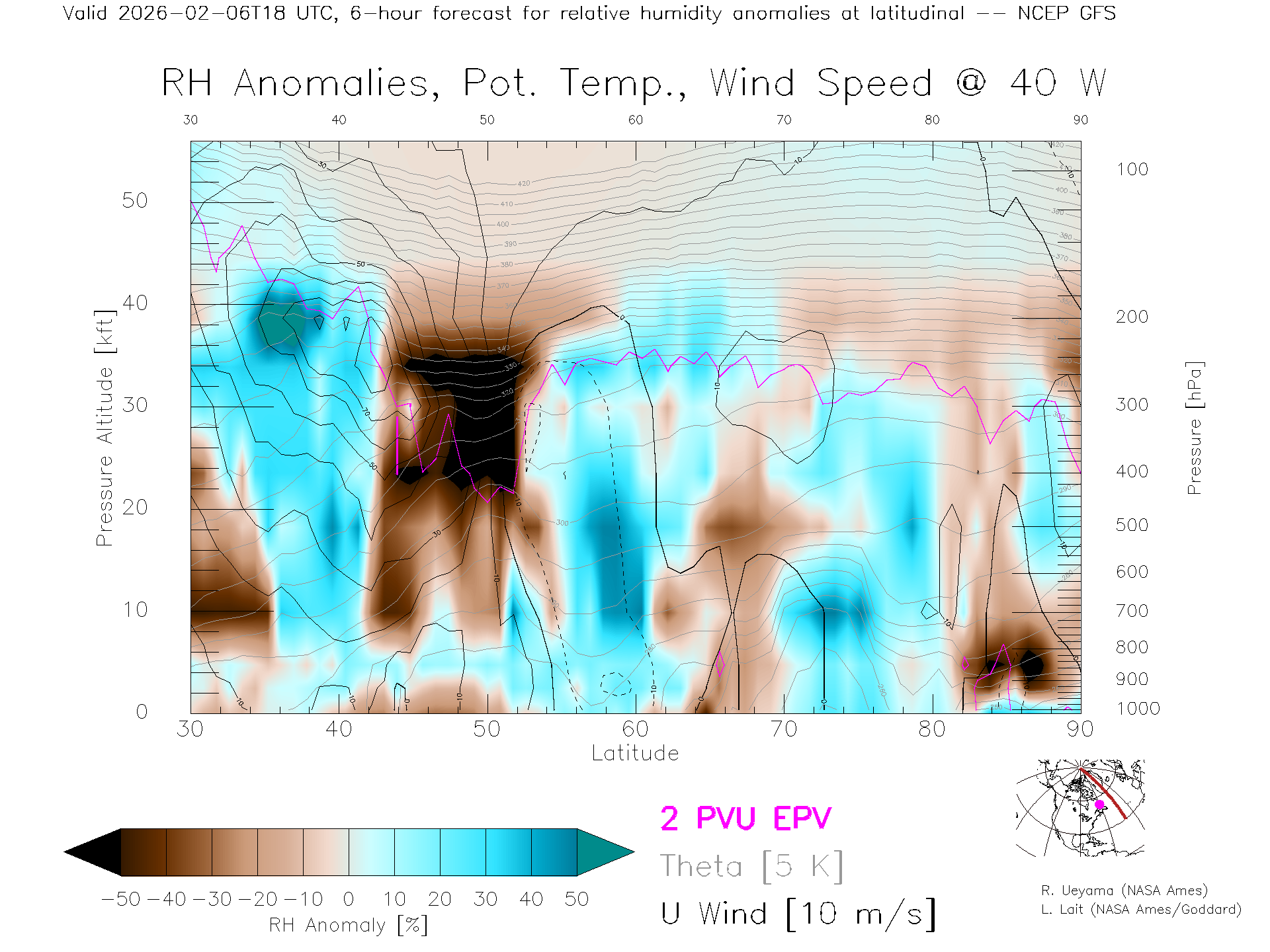 NCEP GFS Forecast Rel. Hum. X-Section (40 W)