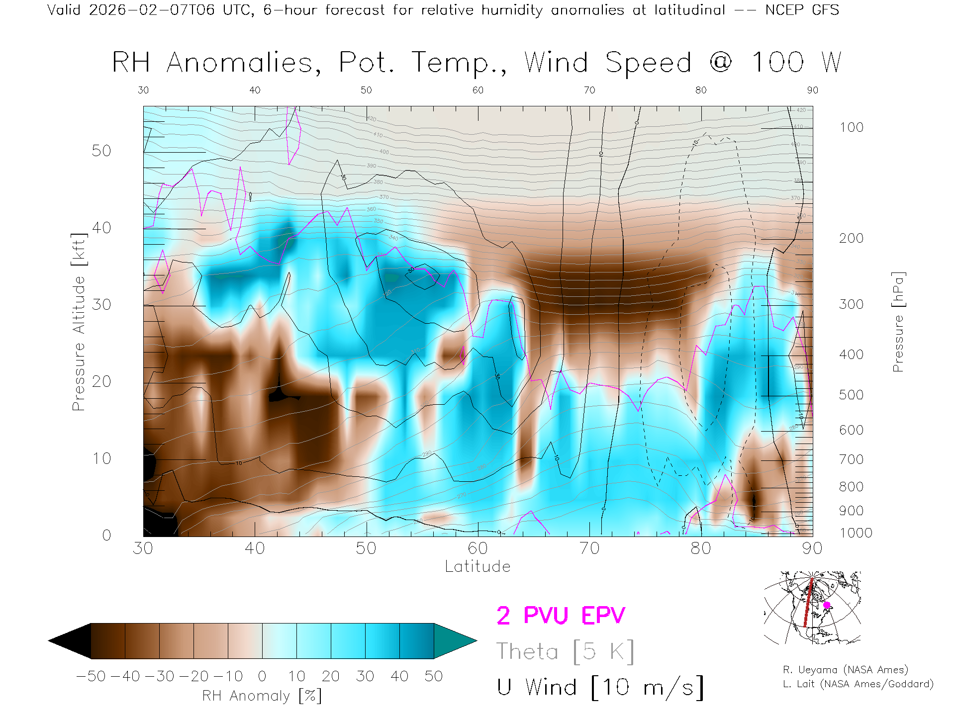 NCEP GFS Forecast Rel. Hum. X-Section (100 W)
