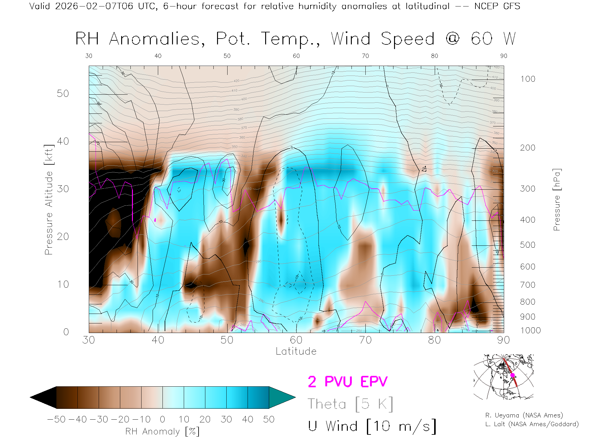 NCEP GFS Forecast Rel. Hum. X-Section (60 W)