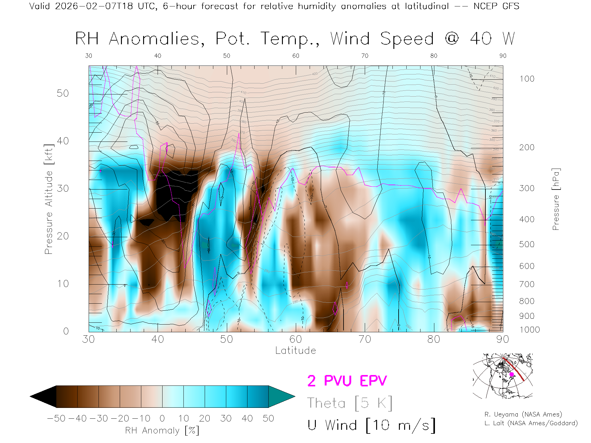 NCEP GFS Forecast Rel. Hum. X-Section (40 W)