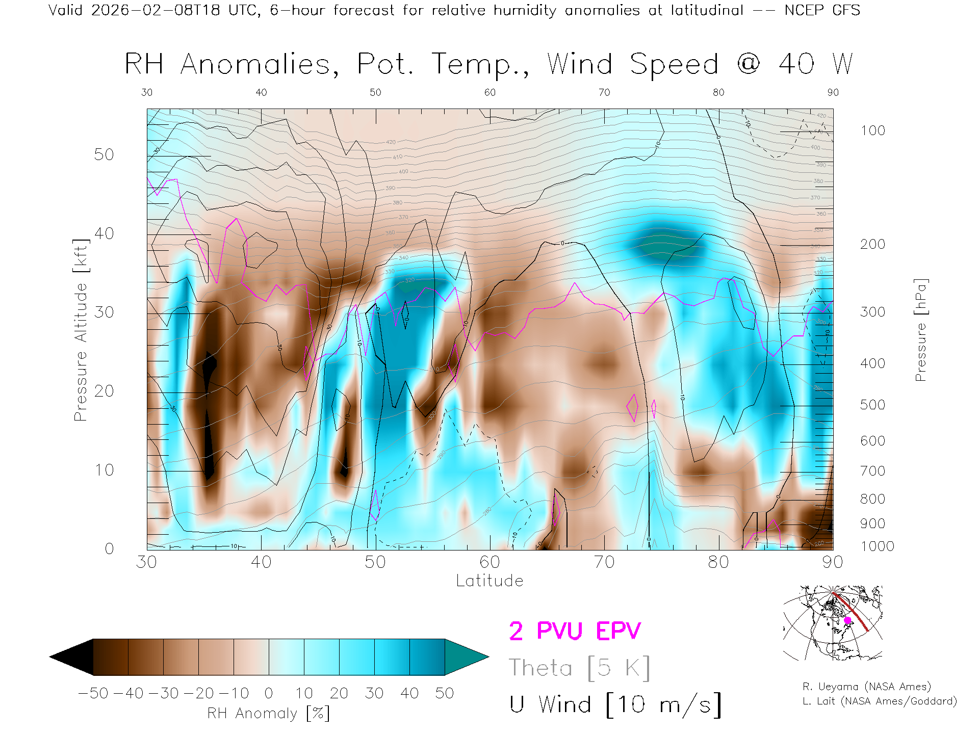 NCEP GFS Forecast Rel. Hum. X-Section (40 W)