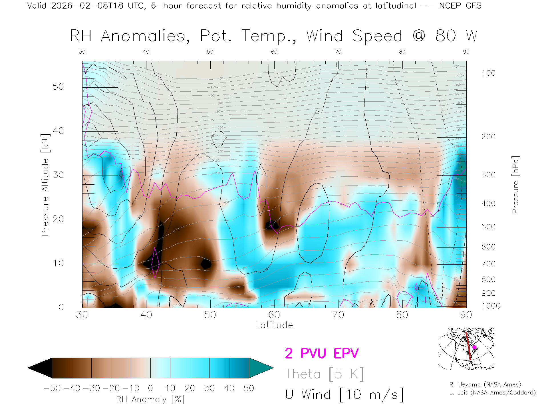 NCEP GFS Forecast Rel. Hum. X-Section (80 W)