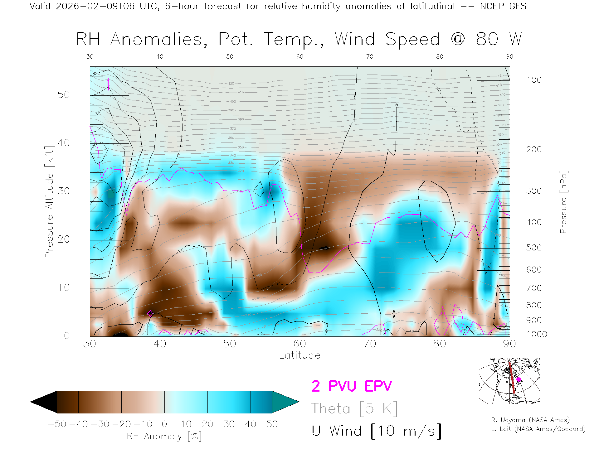 NCEP GFS Forecast Rel. Hum. X-Section (80 W)