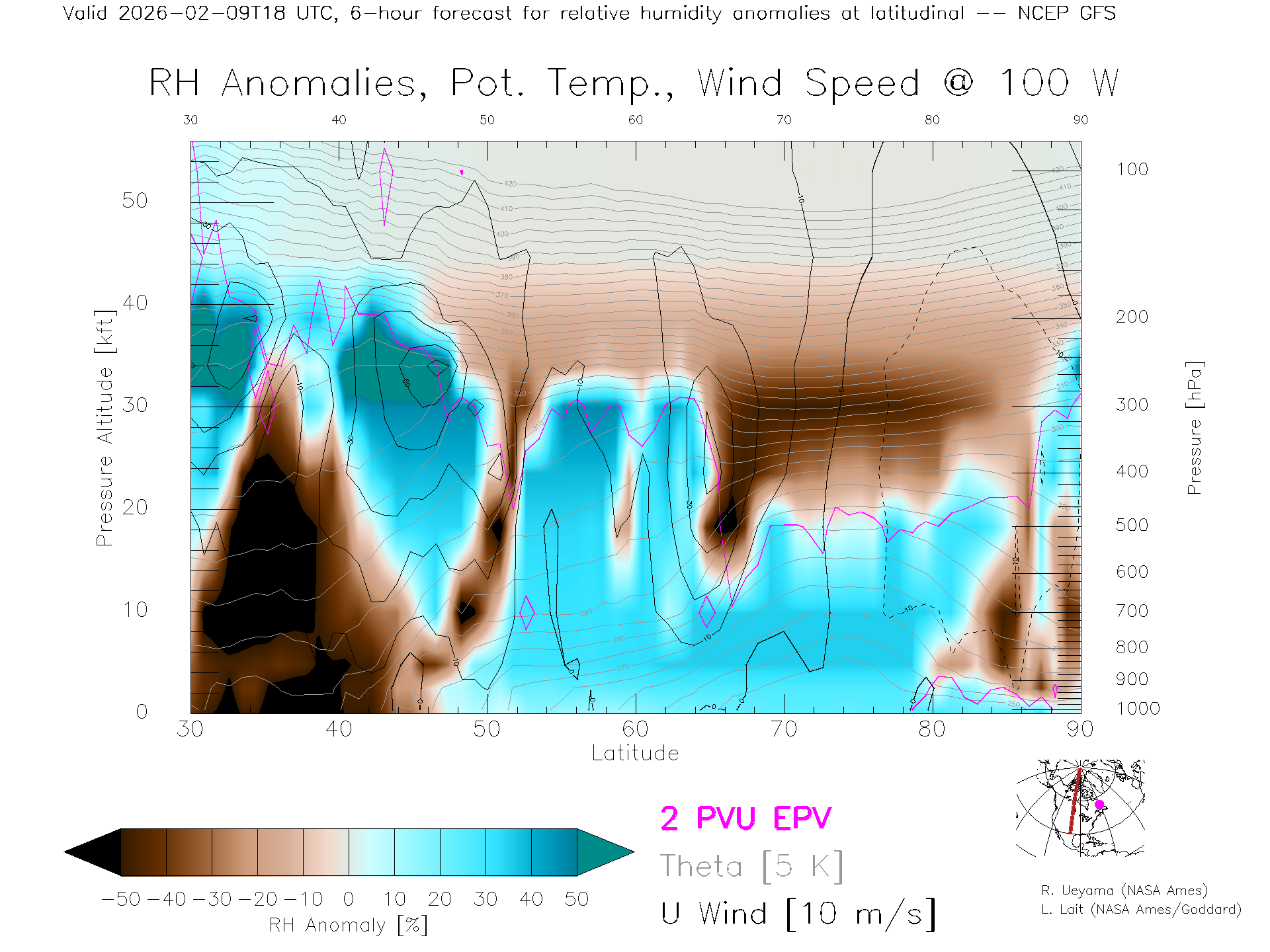 NCEP GFS Forecast Rel. Hum. X-Section (100 W)