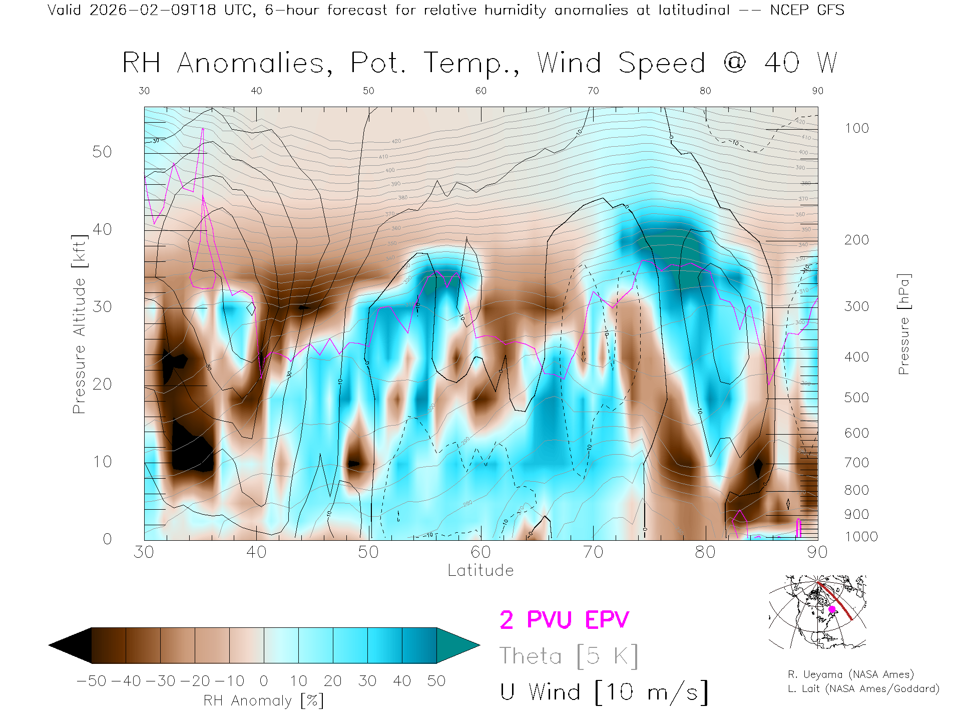 NCEP GFS Forecast Rel. Hum. X-Section (40 W)