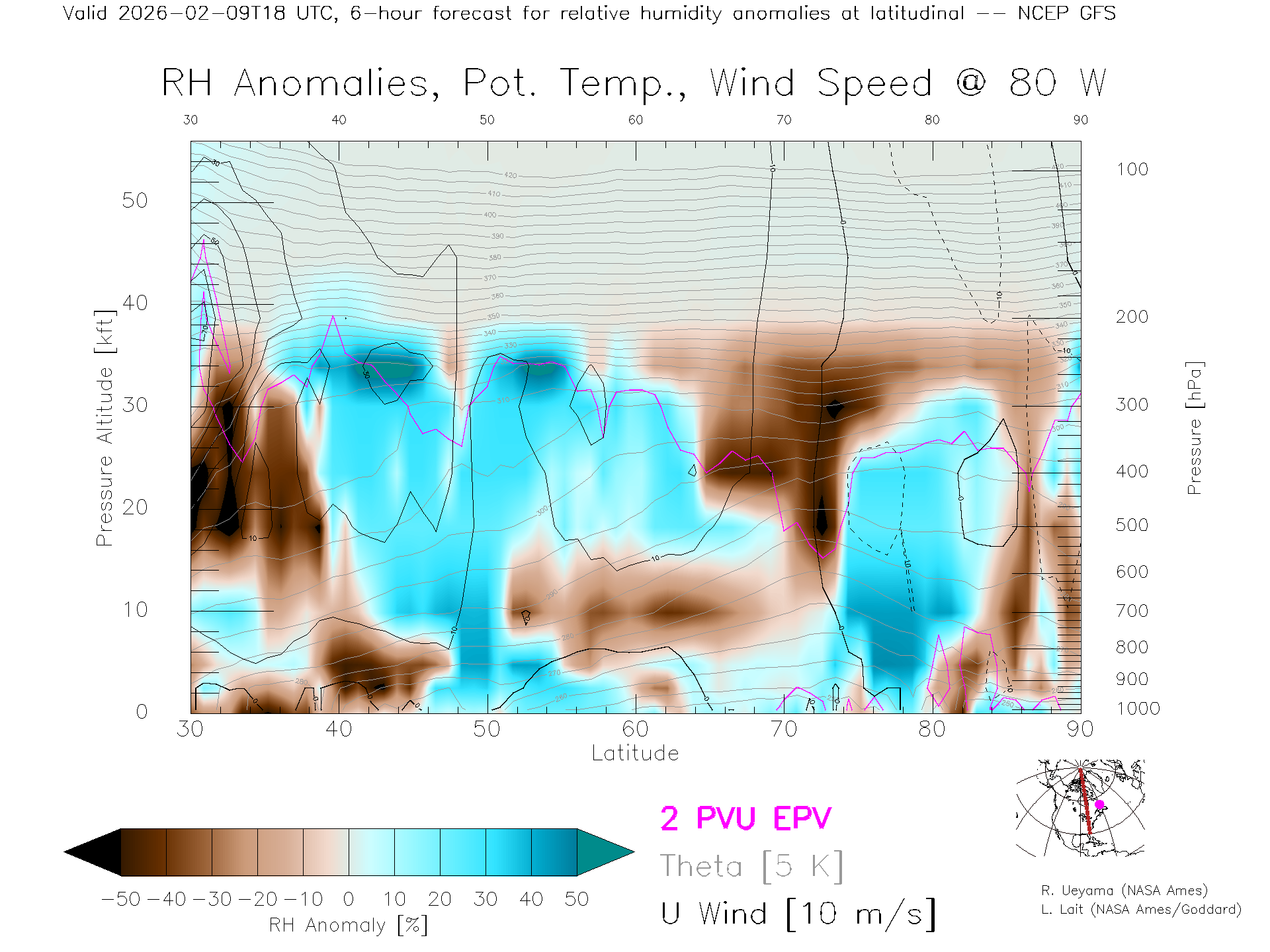 NCEP GFS Forecast Rel. Hum. X-Section (80 W)