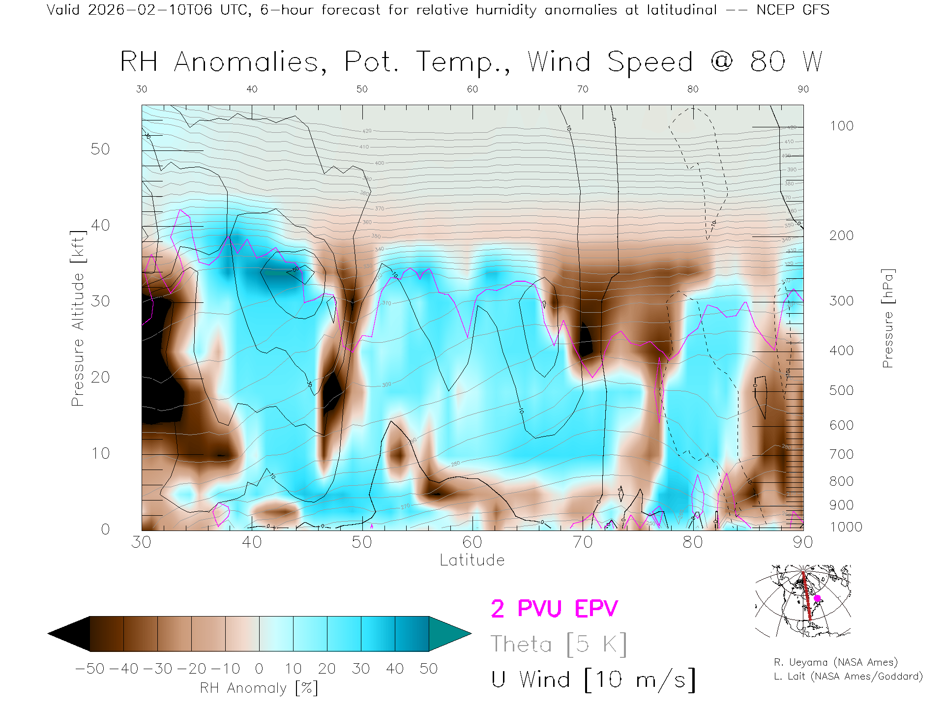 NCEP GFS Forecast Rel. Hum. X-Section (80 W)