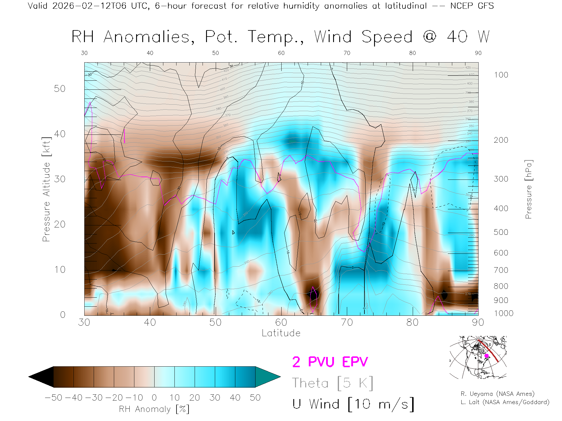 NCEP GFS Forecast Rel. Hum. X-Section (40 W)