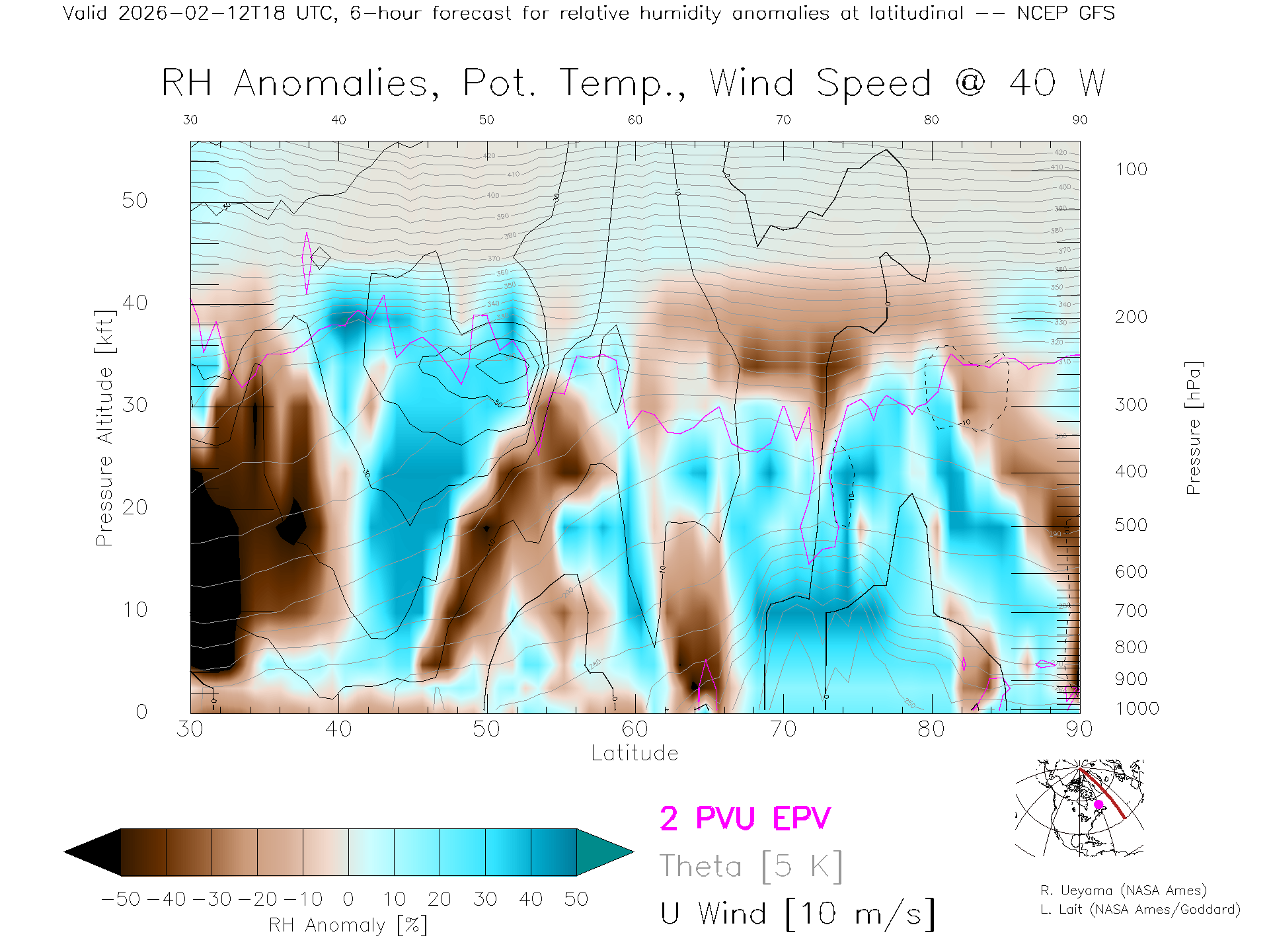 NCEP GFS Forecast Rel. Hum. X-Section (40 W)