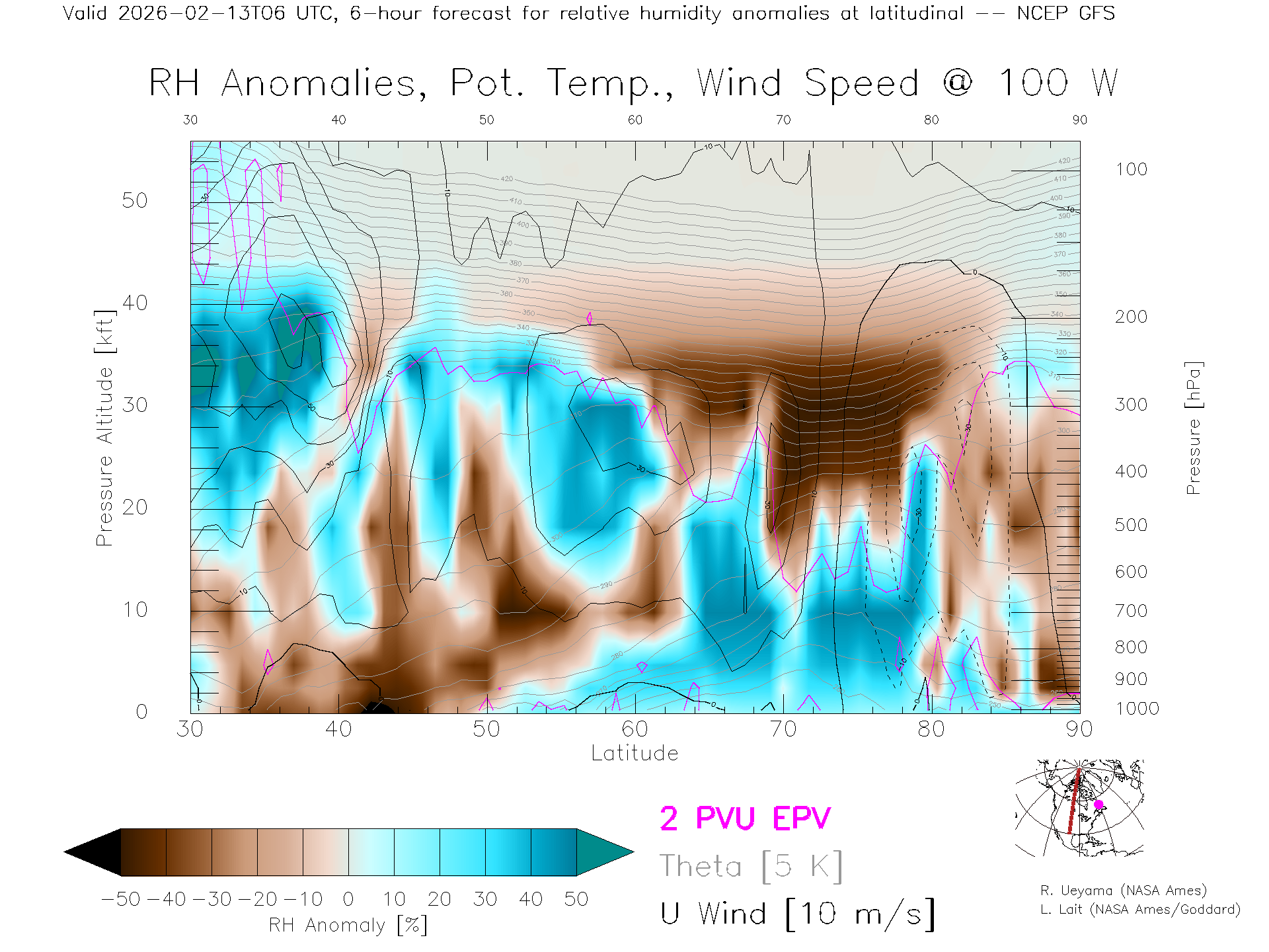 NCEP GFS Forecast Rel. Hum. X-Section (100 W)
