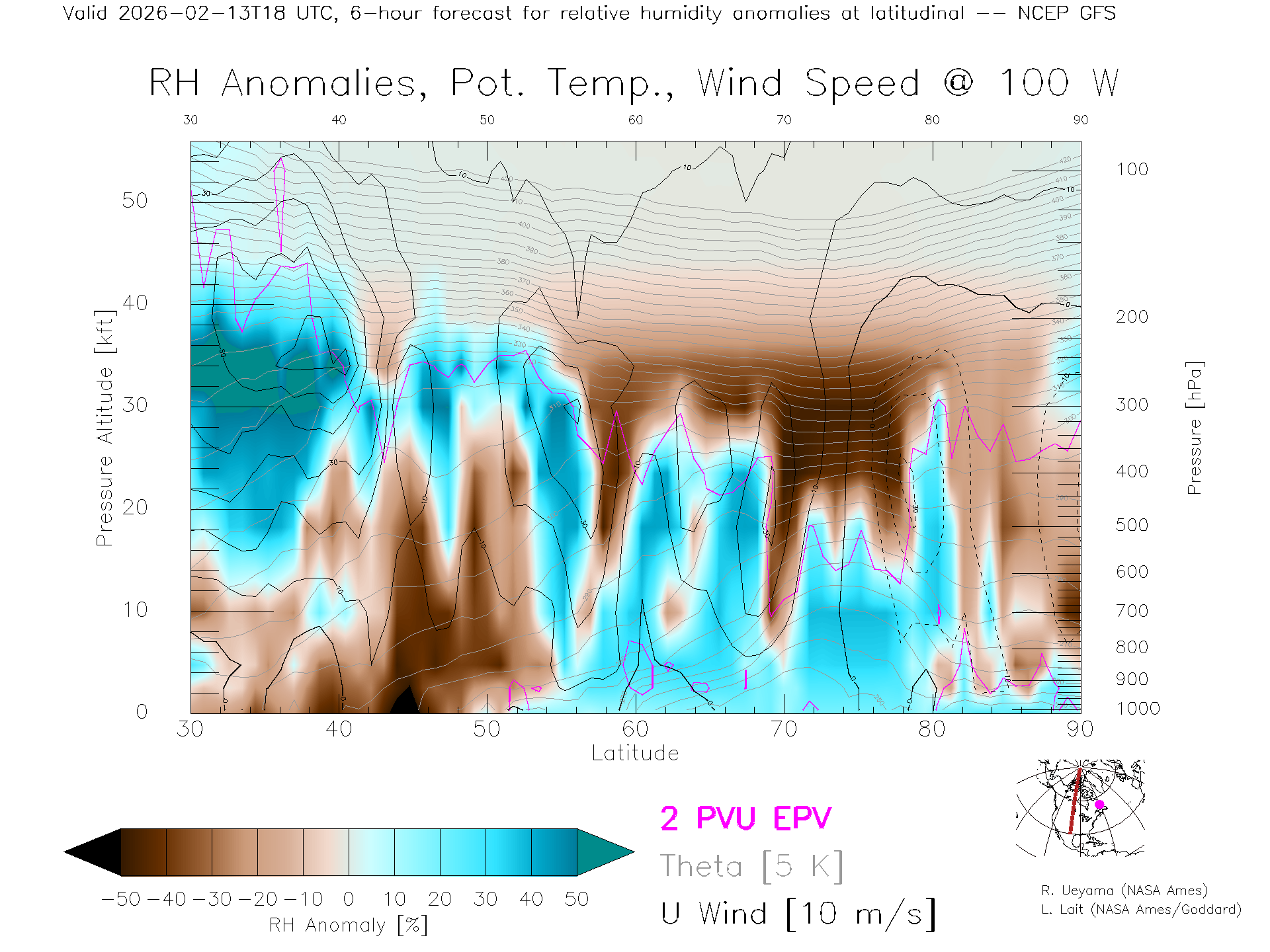 NCEP GFS Forecast Rel. Hum. X-Section (100 W)