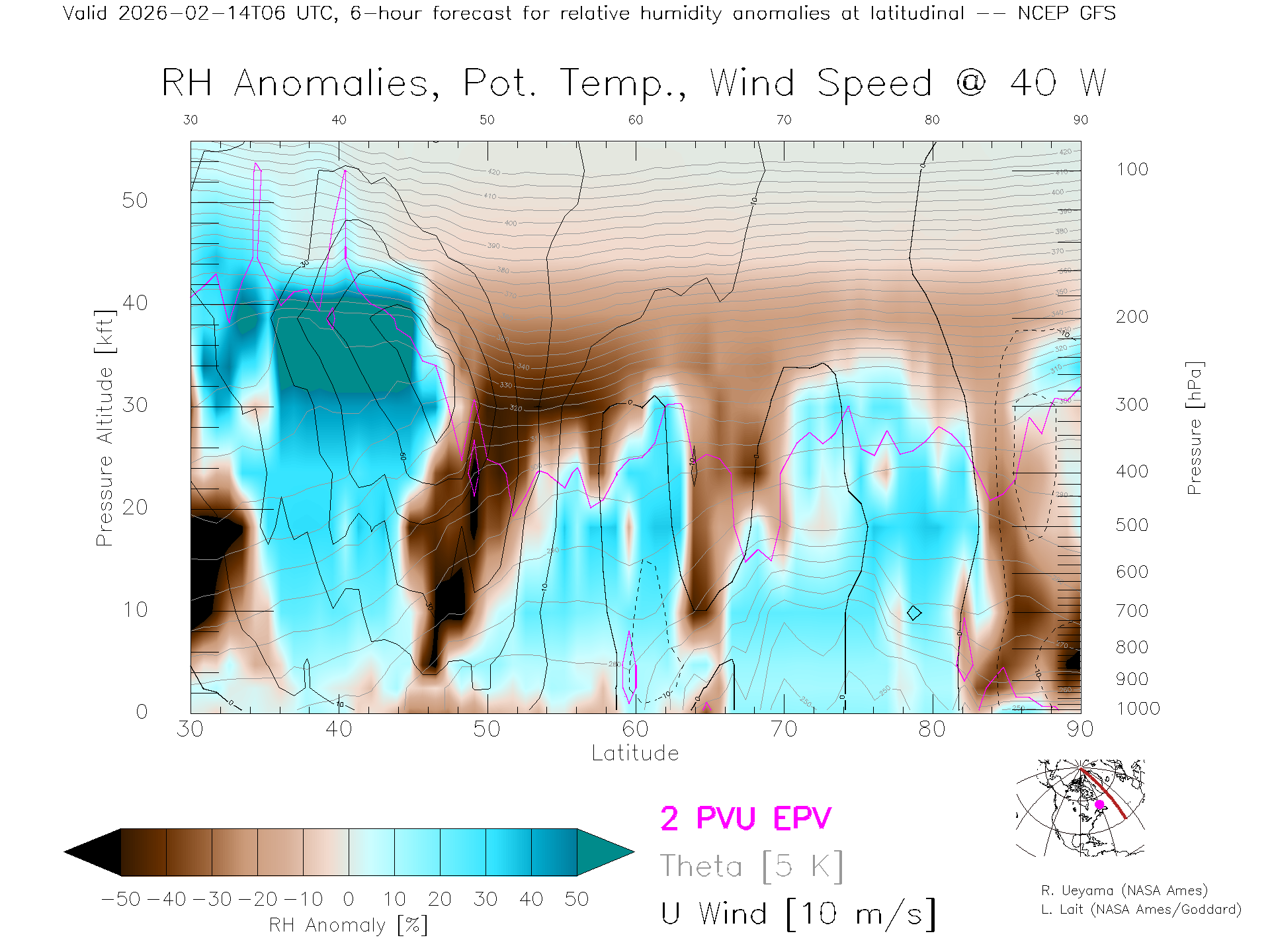 NCEP GFS Forecast Rel. Hum. X-Section (40 W)