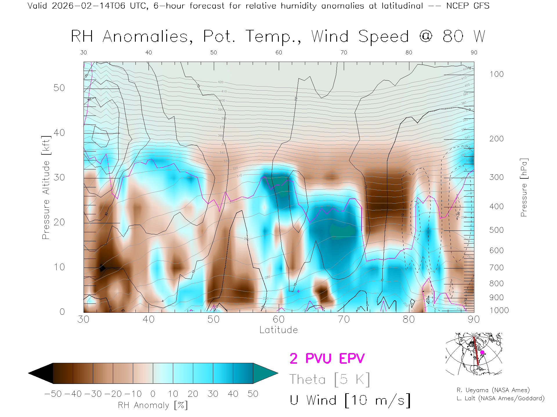 NCEP GFS Forecast Rel. Hum. X-Section (80 W)