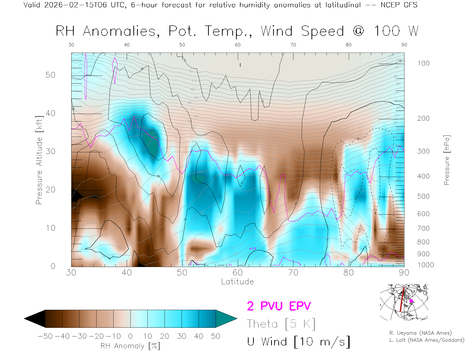 NCEP GFS Forecast Rel. Hum. X-Section (100 W)