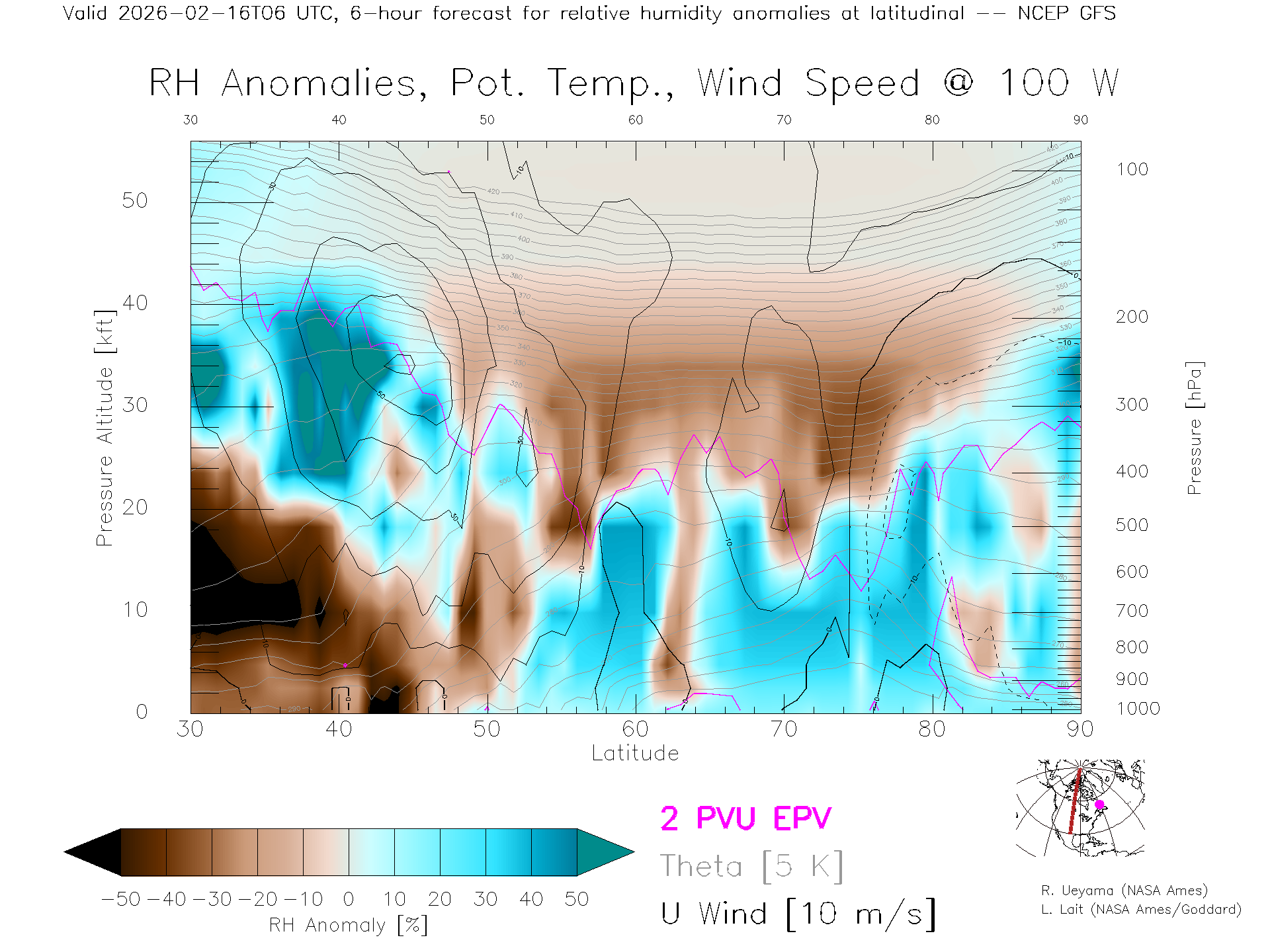 NCEP GFS Forecast Rel. Hum. X-Section (100 W)