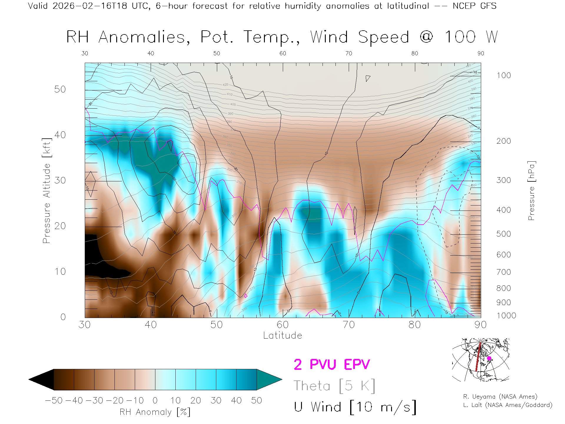 NCEP GFS Forecast Rel. Hum. X-Section (100 W)