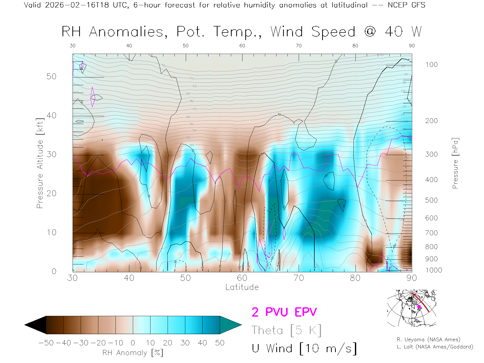 NCEP GFS Forecast Rel. Hum. X-Section (40 W)