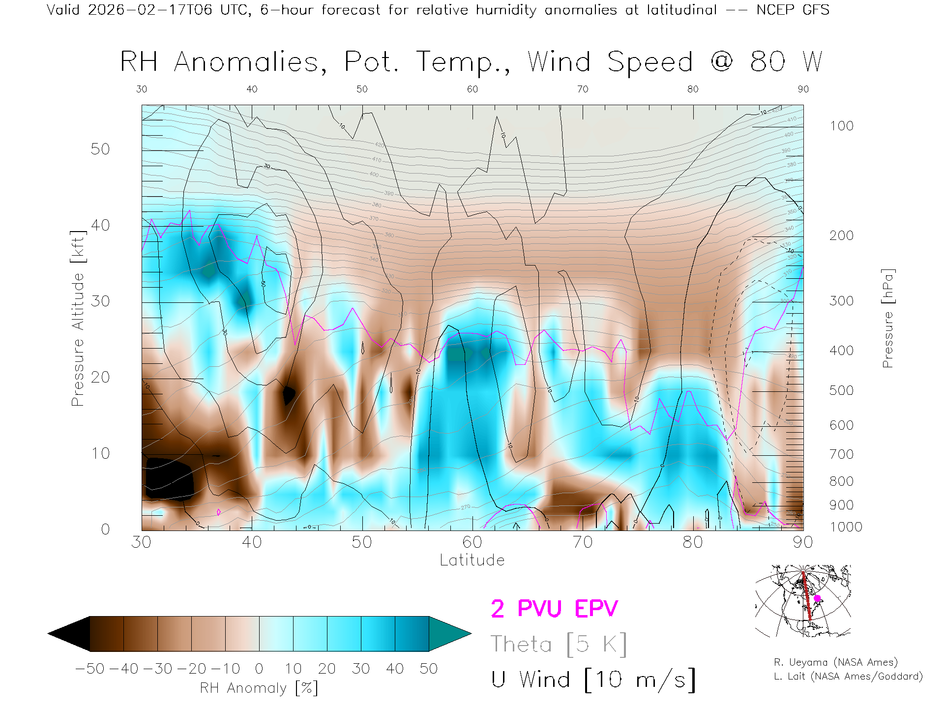 NCEP GFS Forecast Rel. Hum. X-Section (80 W)