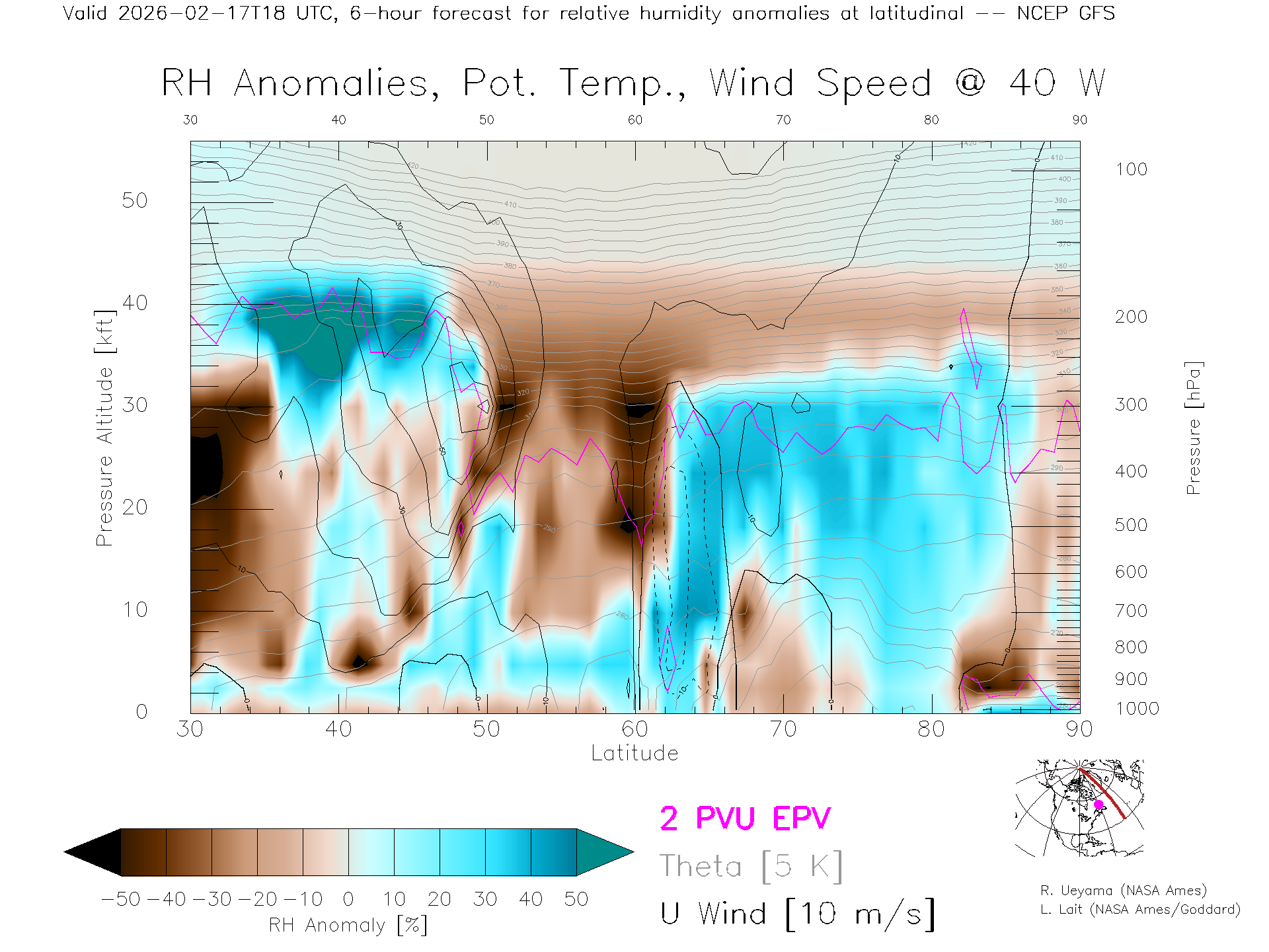 NCEP GFS Forecast Rel. Hum. X-Section (40 W)