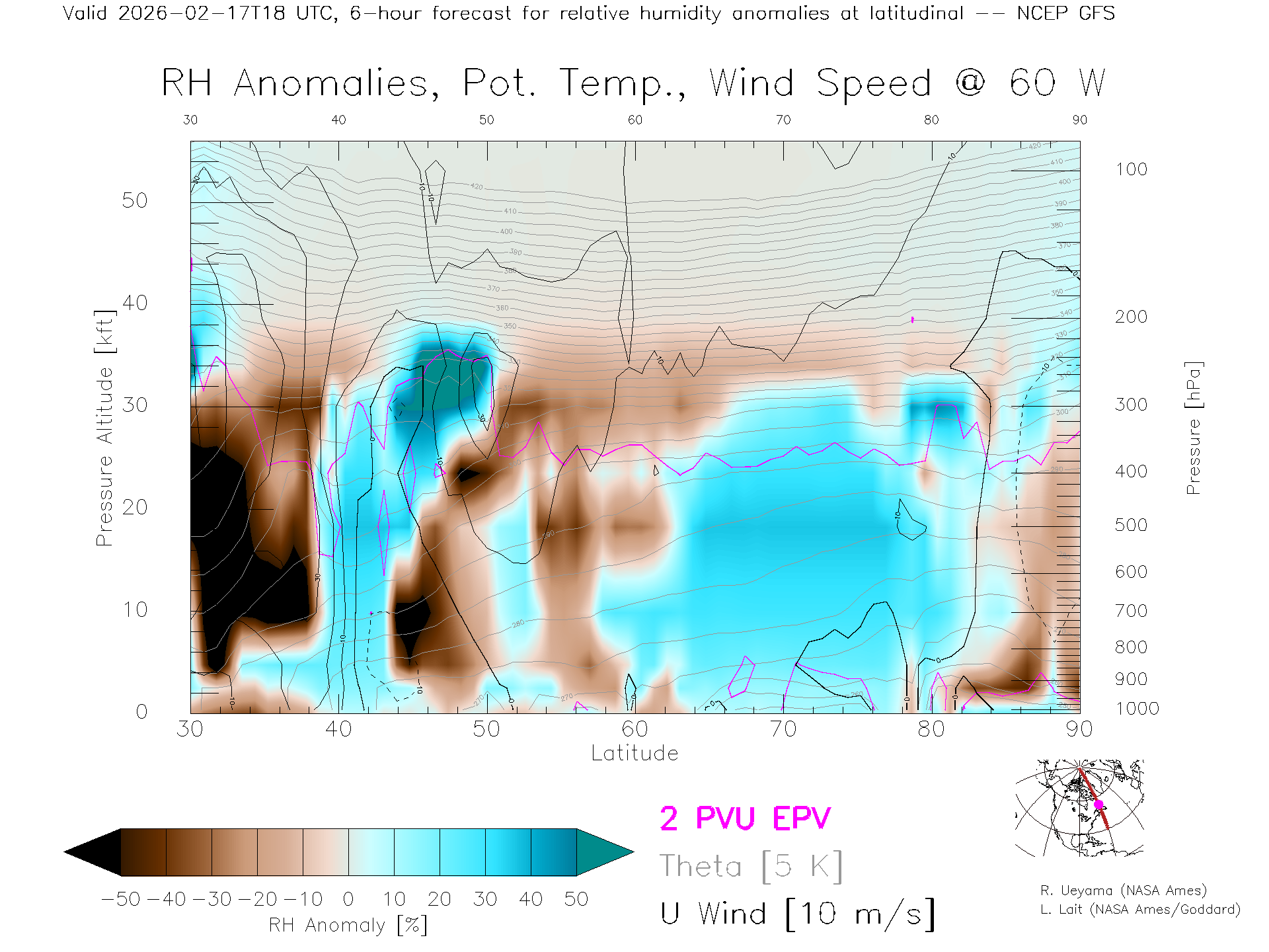 NCEP GFS Forecast Rel. Hum. X-Section (60 W)