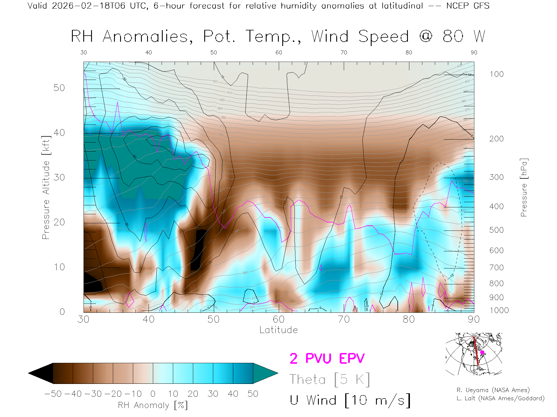 NCEP GFS Forecast Rel. Hum. X-Section (80 W)