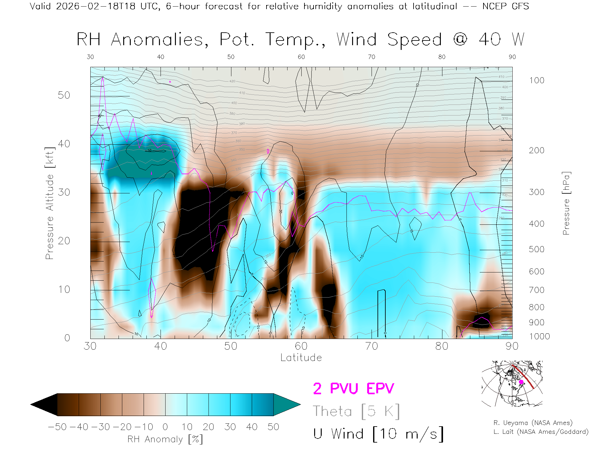 NCEP GFS Forecast Rel. Hum. X-Section (40 W)