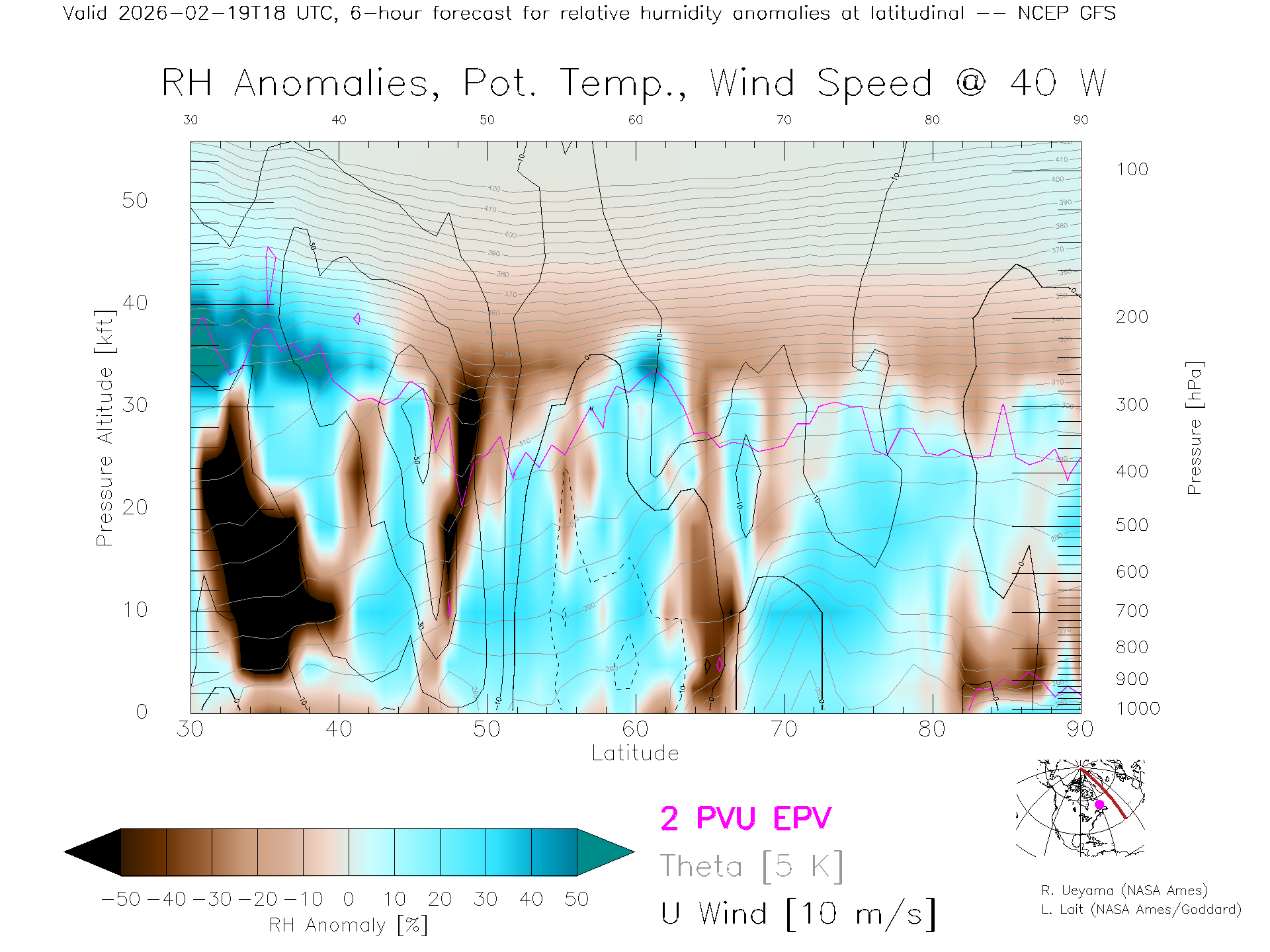 NCEP GFS Forecast Rel. Hum. X-Section (40 W)