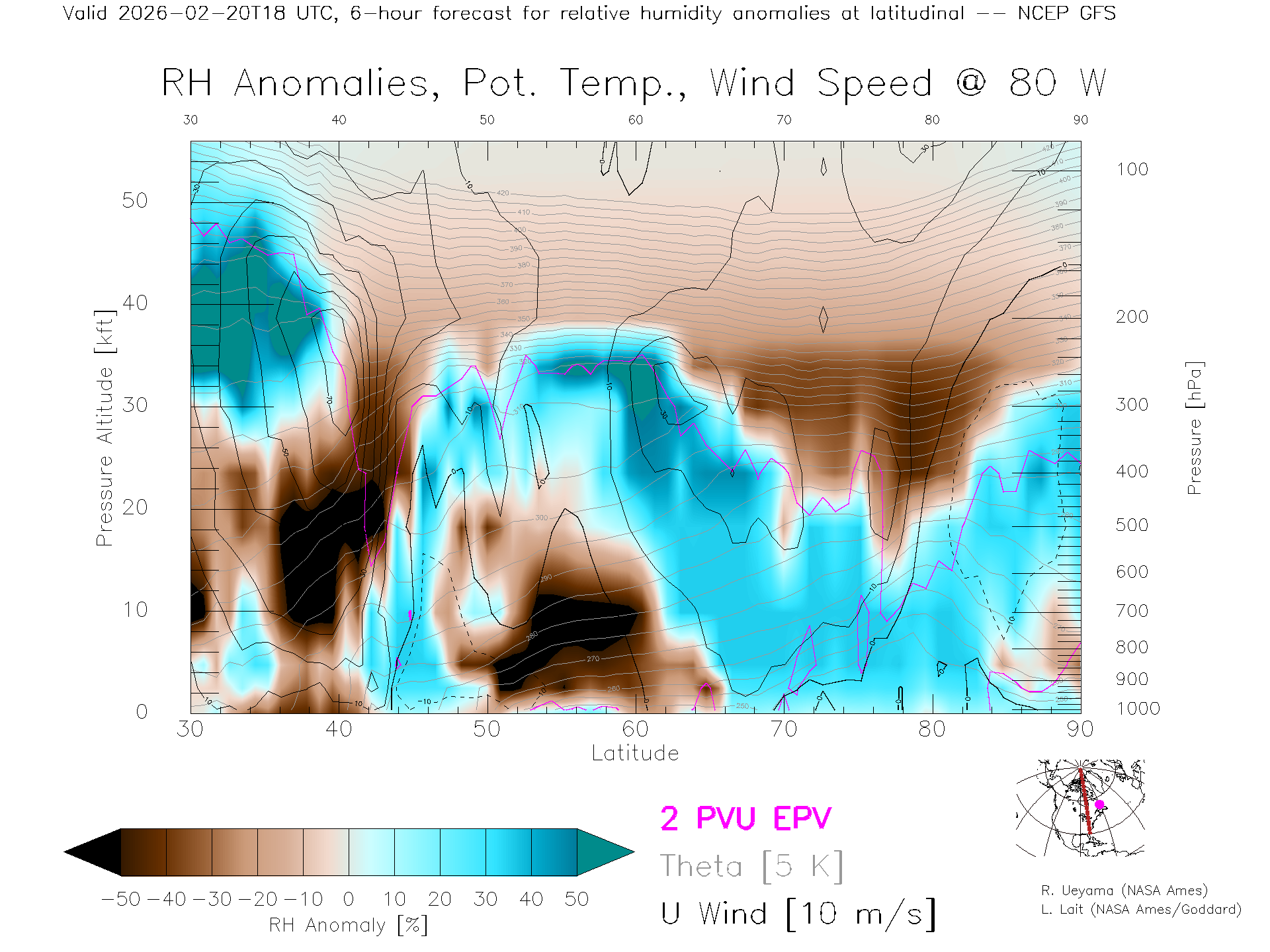 NCEP GFS Forecast Rel. Hum. X-Section (80 W)