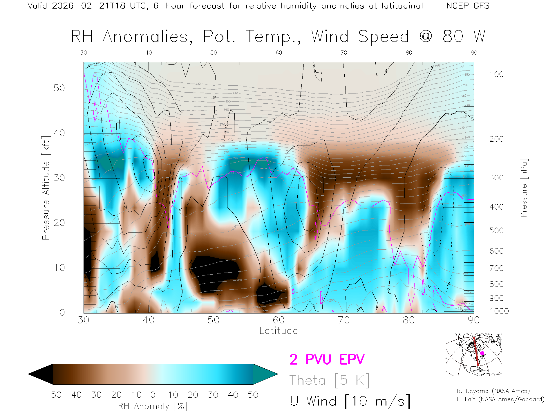NCEP GFS Forecast Rel. Hum. X-Section (80 W)